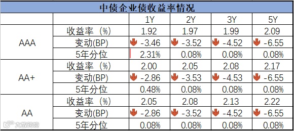 信用债方面,各期限中短期票据和企业债到期收益率整体上行,中债中短期票据到期收益率1年期下行0.13bp,3年期上行2.05bp;企业债到期收益率1年期下行1.13bp,3年期上行2.05bp。
