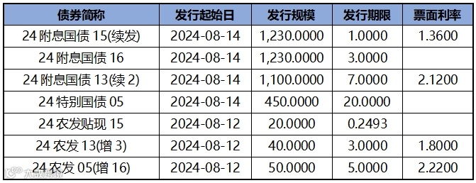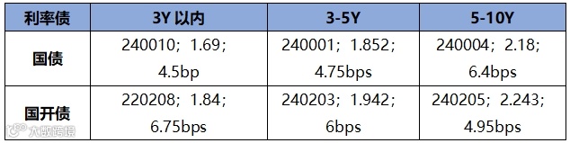 利率债发行方面,上周发行投标热度较上上周有所下降,热门券种2年期24进出02(增11),全场倍数8.71,边际倍数1.3333;3年期24进出03(增14),全场倍数8.3967,边际倍数1.5652。上周利率债发行价格和机构投标情绪如下表所示: