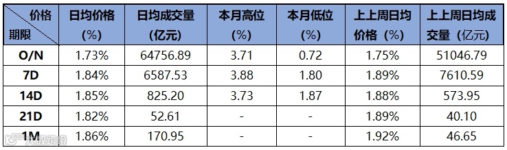 上周资金面前半周宽松、后半周收紧,周一到周三银行和非银融出正常,加权价格较低,周四到周五资金全面收紧,加权价格上行,周五隔夜加权1.85%,隔夜押信用维持在1.95%-2.00%,7d押信用1.95-2.00%。