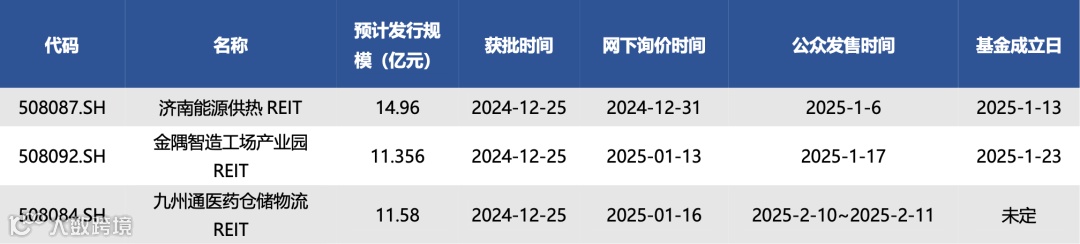 截至1月24日,已获批待上市REITs共有3只,情况如下表所示: