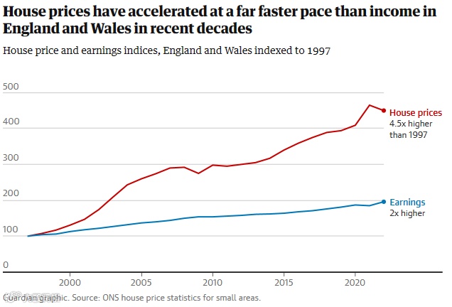 在截至1997年9月的一年中,英国一套中等价位的房子的价格是全职工资中位数的3.5倍,即所有收入按大小升序排列的中点房子。到2022年,这一比例已经增长到一个人收入中值的8.3倍。