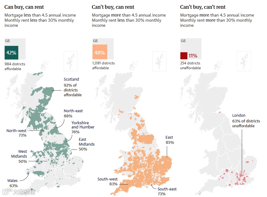 相比之下,有数据可查的苏格兰中,92%的地区是典型的当地夫妇能够负担得起的,他们可以根据要价租房或买房,紧随其后的是英格兰东北部,这一比例为88%。