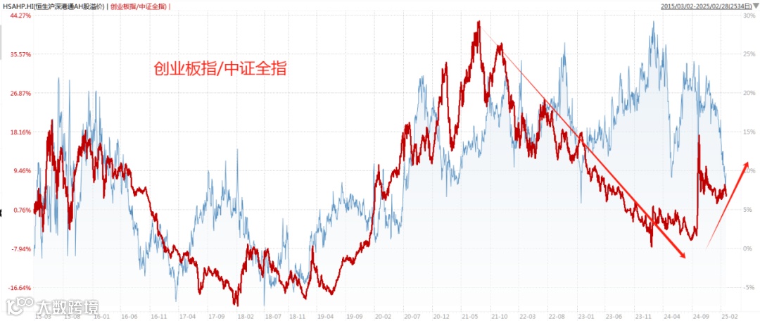 A股也是类似的趋势,下图是同期创业板指/中证全指的走势。