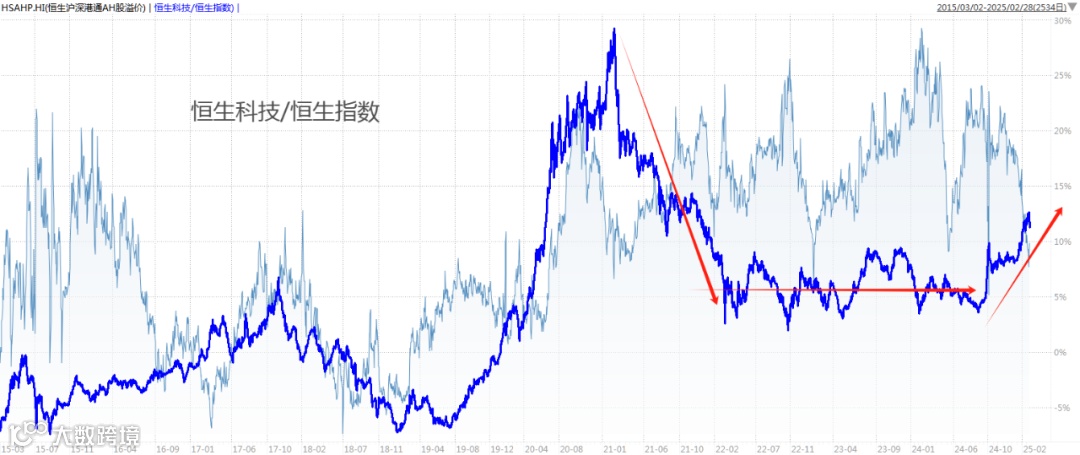 可以看到,过去大致有5个阶段A股、港股轮流跑赢。从2022年10月开始,港股似乎开始跑赢,尤其是2024年4月开始,两大指标都显示港股开始明显跑赢A股。