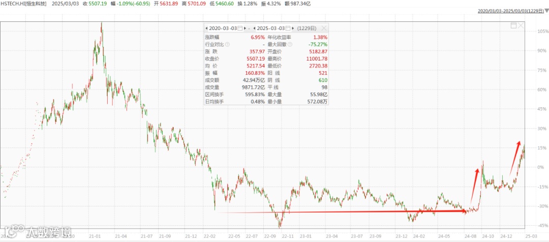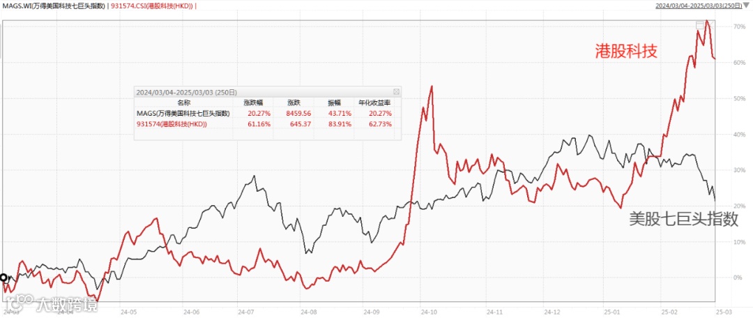 下图是近1年港股科技指数的表现对比美股七巨头指数(2024-03-03至2025-03-03,数据来源:Wind)