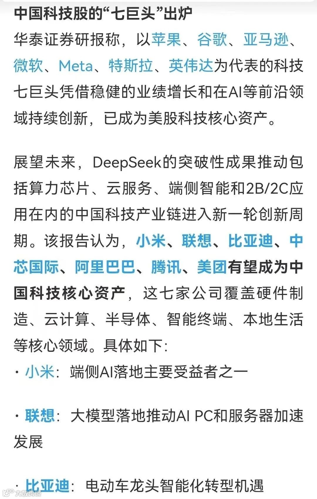 华泰证券提出了中国科技股的“七巨头”(小米、联想、比亚迪、中芯国际、阿里巴巴、腾讯、美团,对标美股“七巨头”。