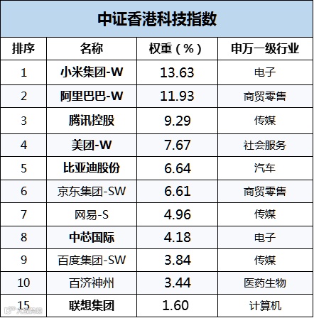 编制规则和恒生科技类似:从中证香港300指数样本中,选取50只通信、互联网、医疗器械、生物科技、电子、半导体、新能源等行业的,市值较大、研发投入较高且营收增速较好的科技龙头作为成分股。