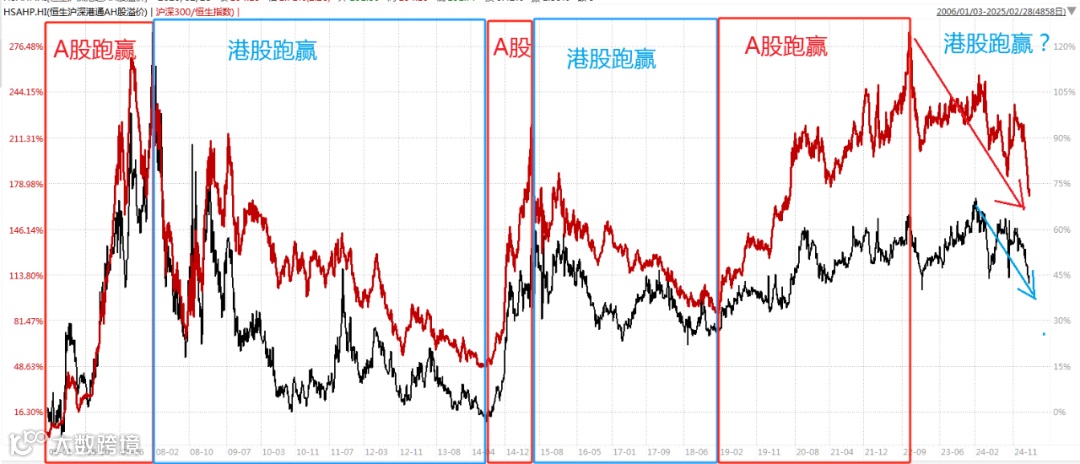 用两个数据观察A股/港股的强弱趋势,恒生AH溢价指数(下图黑线)和沪深300/恒生指数(红线),这两个指数走势向下代表港股跑赢。(2006-1-3至2025-2-28,数据来源:Wind)