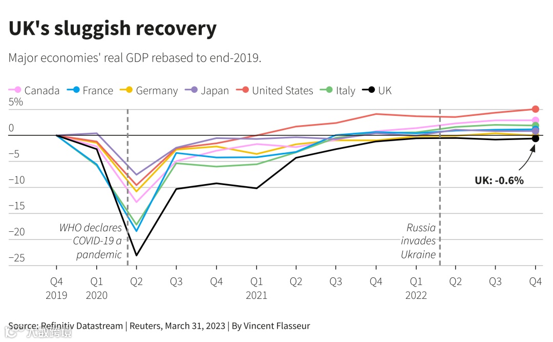 尽管有所改善,英国经济产出仍比2019年底的水平低0.6%,是唯一没有从疫情恢复过来的G7经济体。