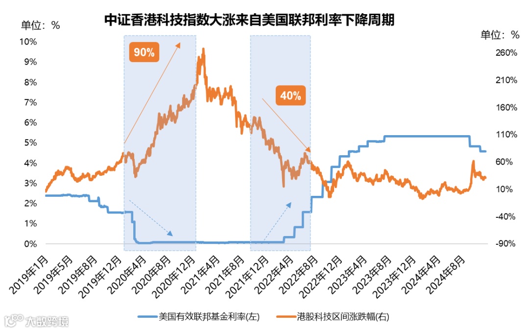 历史上中证香港科技指数的大涨幅均来出现在美国联邦利率下降的周期。2020一季度至2021一季度,美国处于降息低息环境,流动性充足,叠加A股牛市效应,中证香港科技指数区间涨幅约90%;2021四季度至2022四季度,美国处于加息周期,且叠加国内外各种行业政策压制,中证香港科技指数跌幅达40%。