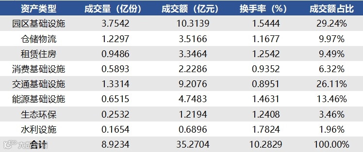 2025年1月6日至2025年1月10日,合计成交量8.9234亿份,成交额35.2704亿元,区间换手率1.2402%。各资产类型方面,本周园区基础设施REITs成交量最高,共计3.7542亿份;水利设施REITs成交量最低,共计0.1654亿份。另外在成交额占REITs总成交额比重中,园区基础设施REITs(29.24%)排名较高,水利设施REITs(1.96%)排名较低。
