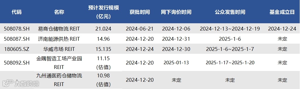 截至1月10日,已获批待上市REITs共有5只,情况如下表所示: