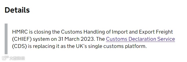 根据英国海关的提醒,旧的CHIEF系统进口申报将会在2022年9月30日之前关闭,并且将于2023年3月31日关闭CHIEF系统上的出口申报。如果不迁移到英国新的CDS系统,将影响货物的进出口。