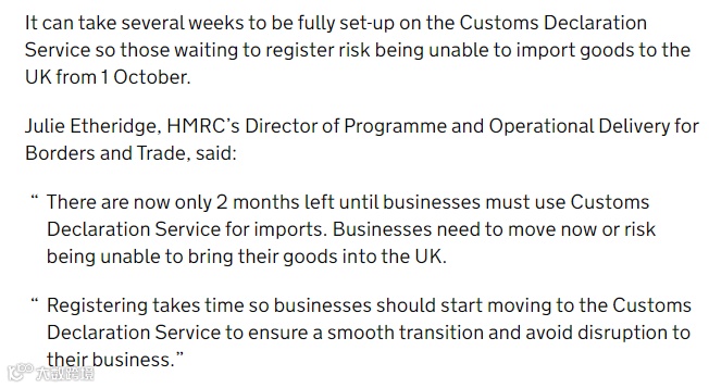 2. 在2022年9月30日之后,英国会停止旧的CHIEF系统的进口申报功能,那也就是说,想要顺利清关,需要转移至CDS清关系统,否则将可能无法将商品进口到英国。