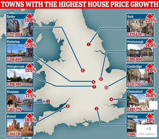 据哈利法克斯银行(Halifax)提供的数据显示,房价增长最快的城镇在过去一年中上涨了5万英镑以上。