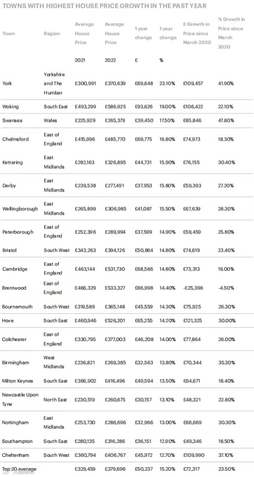 可以看到,约克(York)是2022年房价涨幅最高的城市。在过去一年中,当地房价上涨23.1%,相当于£69,648。