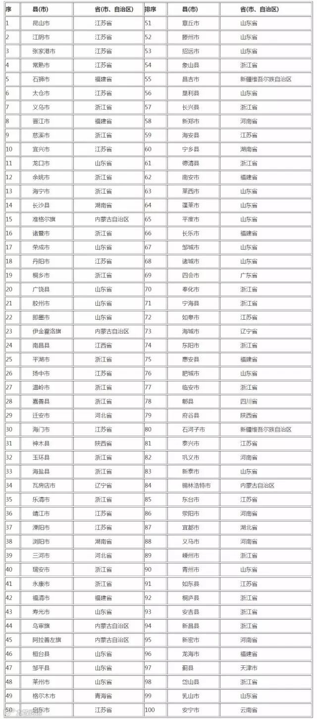 “2016年县域经济100强”榜单中,江苏省昆山市名列第一。浙江、山东、江苏成为“百强县”盛产地,分别有26席、22席、17席,占据全国百强县的65%,广东省仅1席。