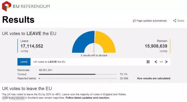 一个改写欧洲历史的结果出来了,英国正式脱离欧盟。截止下午1点45分,关于英国4650万选民举行公民投票决定是否脱离欧洲联盟,根据BBC对公投结果直播显示,在72%出席投票的公民里,有1711.46万个选民支持脱离欧盟,1590.86万个选民希望留在欧盟,支持脱欧者超过半数。