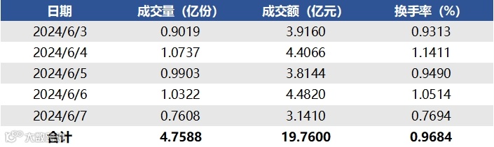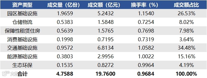 2024年6月3日至2024年6月7日,合计成交量4.7588亿份,成交额19.7600亿元,区间换手率0.9684%。各资产类型方面,上周园区基础设施REITs成交量最高,共计1.9659亿份;生态环保基础设施REITs成交量最低,共计0.1535亿份。另外在成交额占REITs总成交额比重中,交通基础设施REITs(34.48%)排名较高,消费基础设施REITs(3.64%)排名较低。