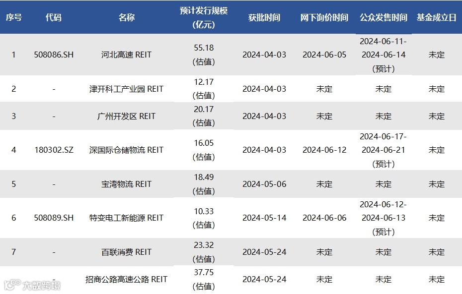 截至6月7日,已获批待上市REITs共有8只,情况如下表所示: