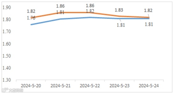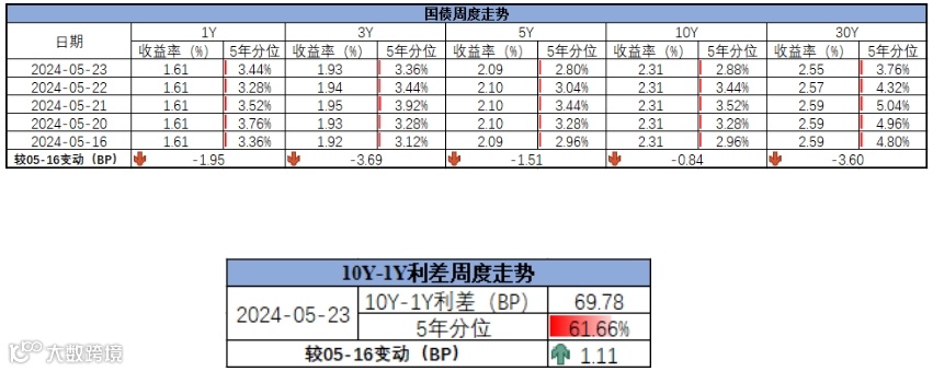 截至5月23日,国债收益率短端长端皆下行,曲线走抖,10Y-1Y利差为69.78,较5月16日走扩1.11BP,处于近5年61.66%的历史分位。