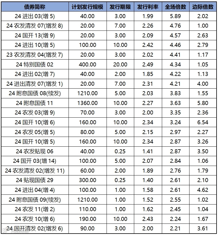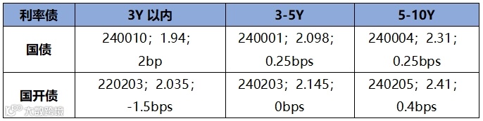 利率债发行方面,上周发行投标热度较上上周有所下降,热门券种3年期24进出03(增5),全场倍数5.89,边际倍数2.02;7年期24农发清发07(增发8),全场倍数4.76,边际倍数1.00。上周利率债发行价格和机构投标情绪如下表所示: