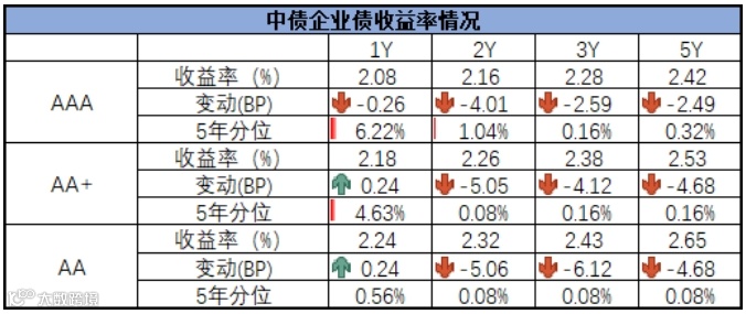 信用债方面,各期限中短期票据和企业债到期收益率整体下行,中债中短期票据到期收益率平均下行2.94bp,企业债到期收益率平均下行2.68bp。
