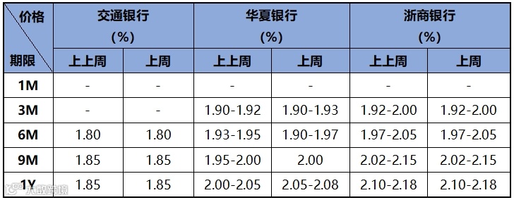 存款价格方面,上周浙商未有存款报价,平均存款利率上升1.5bp,交通银行存款价格普遍上升5bp。近两周存款市场情况如下表所示: