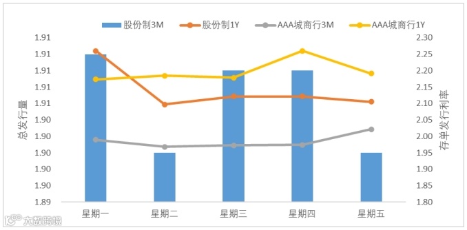期限利差方面,上周发行数量较多的1年期和3个月存单的发行利差为17bp,较上上周利差下降少于1bp。主体利差方面,上周股份制和国有行同业存单利差为4bp,较上上周减少1bp。