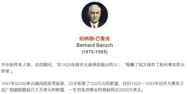 巴鲁克也相当注意对风险的控制。他认为必须经常在手里保留一定的现金;建议投资者每隔一段时间必须重新评估自己的投资,看一看情况变化后股价是否还能达到原来的预期。