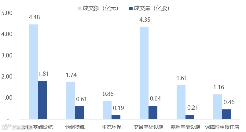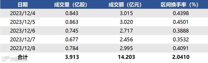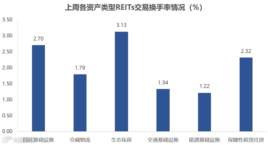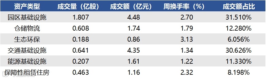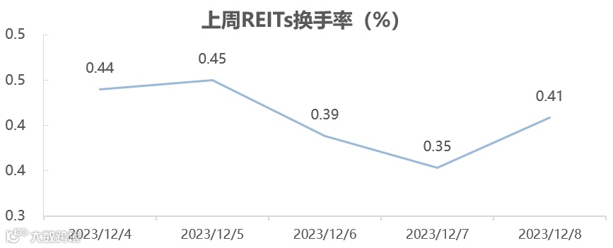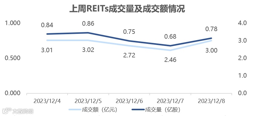2023年12月4日至2023年12月8日,合计成交量3.913亿股,成交额14.203亿元,区间换手率2.041%。各资产类型方面,上周园区基础设施REITs成交量最高,共计1.807亿股;生态环保基础设施REITs成交量最低,共计0.188亿股。另外在成交额占REITs总成交额比重中,园区基础设施REITs(31.510%)排名较高,生态环保REITs(6.056%)排名较低。