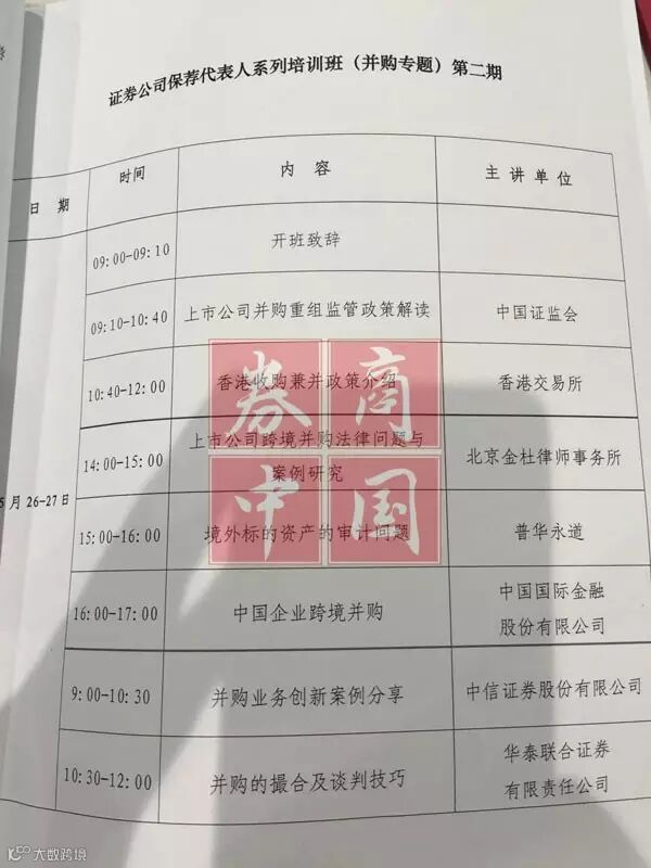 参加第二期培训的华东地区某上市券商保代向券商中国记者透露,此次培训为期一天半,培训科目包括“上市公司并购重组监管政策解读、香港收购兼并政策介绍、上市公司跨境并购法律问题与案例研究、境外标的资产的审计问题、中国企业跨境并购、并购业务创新案例分享、并购的撮合及谈判技巧”等内容。