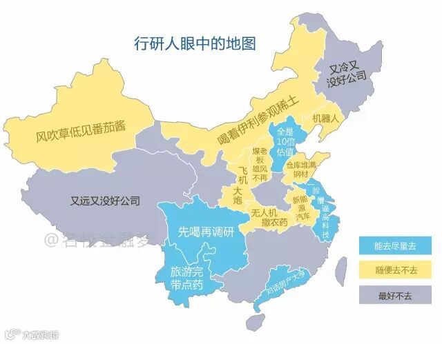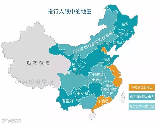 基金经理、分析师、投行人士,他们的职业不同,不同地方的风土人情带给他们的感受也是大相径庭。今天小编就带你看看他们眼中的中国地图。搞笑,但也蕴含着几分道理,和一些职场上的无奈。