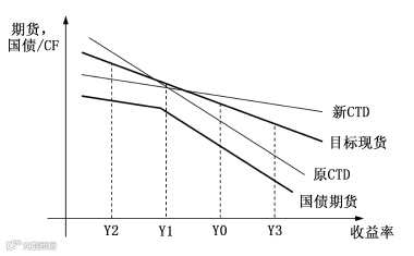 当市场收益率在Y1以下波动时,CTD发生改变,期货的修正久期与目标现货的修正久期之间的关系发生变化,ΔB和ΔF的关系也发生改变。此时,久期较小的券成为CTD,期货跟随新的CTD价格变化,对收益率的敏感性降低,因此ΔF2会小于ΔB2,则ΔB2大于ΔF2×K,出现套保不足。