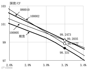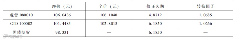 假设当前所有国债的到期收益率都是3.2%,则国债100002是当时的CTD。我们进行期货空头套保,国债现货使用国债080010。各现货与期货的价格如图5所示。