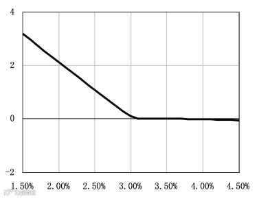 从图中可以看出,当收益率大于3%时,总损益近似水平。我们将3%~4.5%的部分放大观察,得到图9。