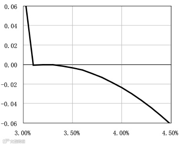可以看出,实际上这部分的曲线也是存在凸性的。总损益是期货损益加上现货损益,其中现货损益的凸性为正,期货由于是做空,损益凸性为负。由于期货跟随CTD走势,其久期最大,所以凸性也最大。期货的负凸性要大于现货的正凸性,两者相加后,总损益的凸性为负。因此出现了图9中的曲线。
