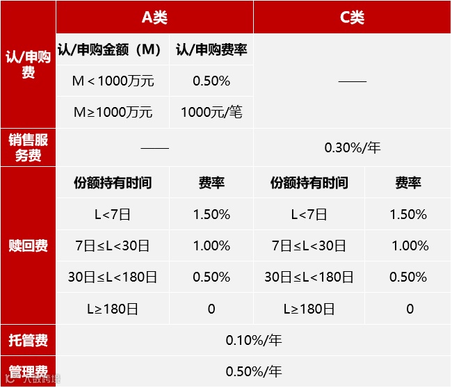注1:上表A类基金份额的认购费及申购费适用于投资者通过其他销售机构认购、申购本基金A类基金份额。通过直销机构认购、申购本基金A类基金份额的不收取认购费、申购费。对于投资者通过直销机构认购、申购、转换转入的C类基金份额计提的销售服务费,或者通过其他销售机构认购、申购、转换转入且持续持有期限超过一年(即365天)的C类基金份额在持有超过一年后继续计提的销售服务费,将在投资者赎回、转换转出相应基金份额或基金合同终止时随赎回款(或转出款或清算款)一并返还给投资者。