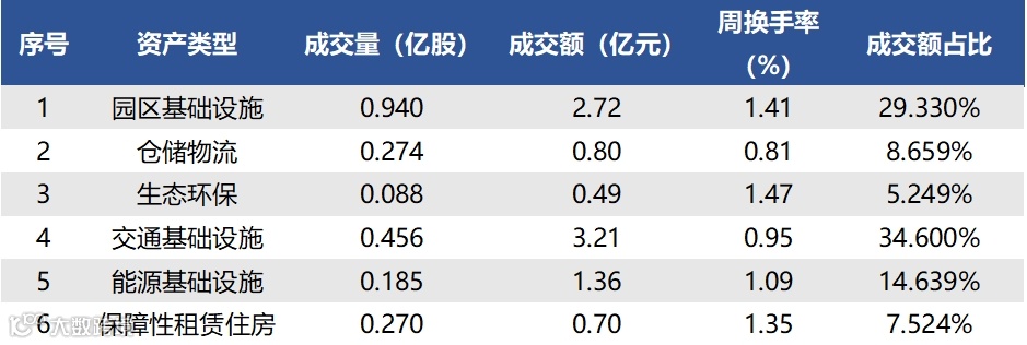 2023年11月13日至2023年11月17日,合计成交量2.214亿股,成交额9.269亿元,区间换手率1.1547%。各资产类型方面,上周园区基础设施REIT成交量最高,共计0.940亿股;生态环保基础设施REIT成交量最低,共计0.088股。另外在成交额占REITs总成交额比重中,园区基础设施REIT(29.330%)排名较高,生态环保REIT(5.249%)排名较低。