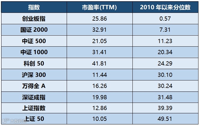 备注:科创50、中证1000、国证2000市盈率(TTM)为指数发布以来的分位数