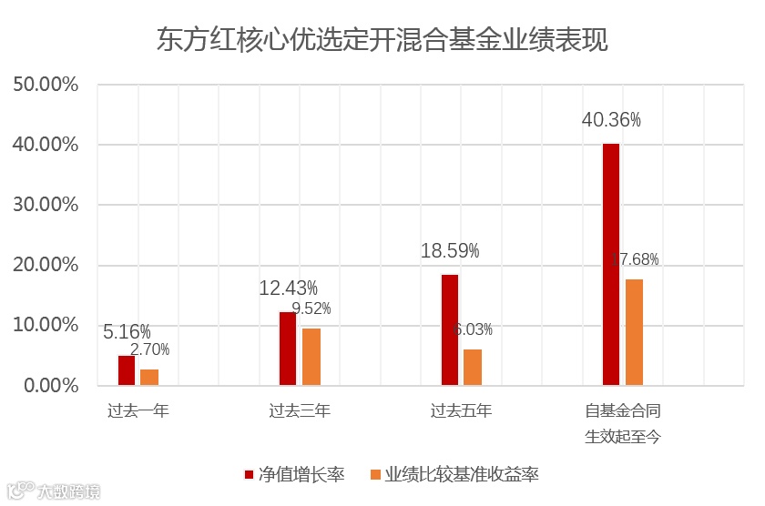 数据是最好的印证,截至2025年12月31日,东方红核心优选定开混合基金自成立以来净值增长率达40.36%,远超业绩比较基准17.68%的收益率,超额收益高达22.68%;分阶段来看,过去一年净值增长率5.16%、过去三年净值增长率12.43%、过去五年净值增长率18.59%,各阶段均显著跑赢基准,展现出穿越牛熊的稳健实力。