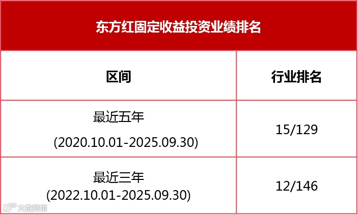 根据国泰海通证券业绩排行榜,截至2025年9月30日,东方红资产管理固定收益类资产投资收益率近五年同类排名TOP15,近三年同类排名前10%。