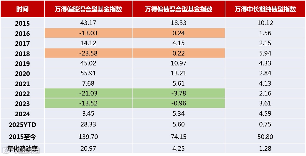 数据来源:Wind 单位:% 数据区间:2015-2024年度,2025.1.1-2025.11.27, 万得偏股混合型基金指数(885001)万得偏债混合型基金指数(885003)、万得中长期纯债型指数(885008)。