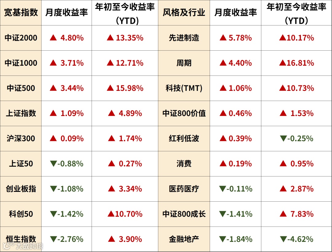 2月行情呈现“先抑后扬”态势,月初市场消化特朗普提名沃什为下届美联储主席引发的政策担忧,全球风险资产普遍承压。2月中旬及春节后,地缘局势升温驱动“涨价逻辑”成为交易主线,且相关领域由有色金属向油气、化工、建材等泛周期领域扩散。主要宽基指数表现分化,小盘风格显著占优,中证2000与中证1000分别上涨+4.8%和+3.7%,领涨宽基指数;科创50和港股表现相对落后。受AI叙事变化影响,市场结构发生显著切换,先进制造与周期板块接棒成为2月领涨方向。
