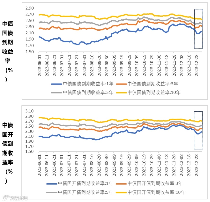 截至周五下午4点,3年期国债活跃券收益率约为2.29%,较上上周上行0.5bp,10年期国债活跃券收益率约为2.516%,较上上周下行3.9bp。
