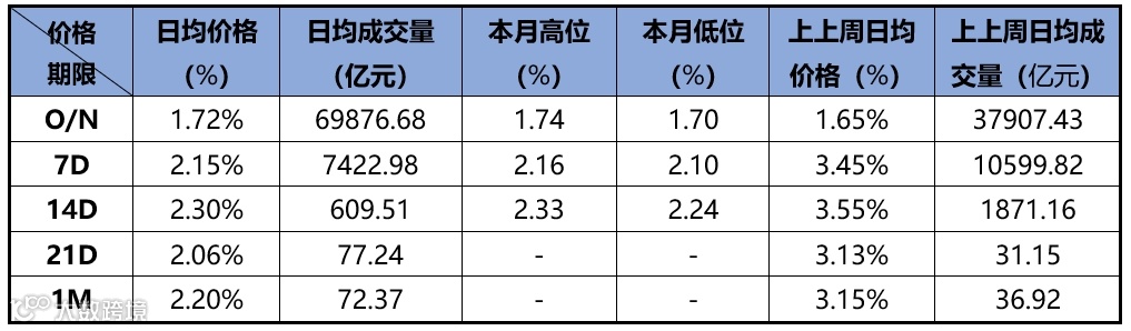 上周隔夜日均成交6.99万亿,比上上周增加3.20万亿,日均价格从1.65%上升至1.72%;7D日均成交量从10599亿下降至上周的7422亿,价格从3.45%下降至2.15%;14D成交量从上上周的1871亿下降至上周的609亿,价格从3.55%下降至2.30%。上周全市场成交情况如下表所示: