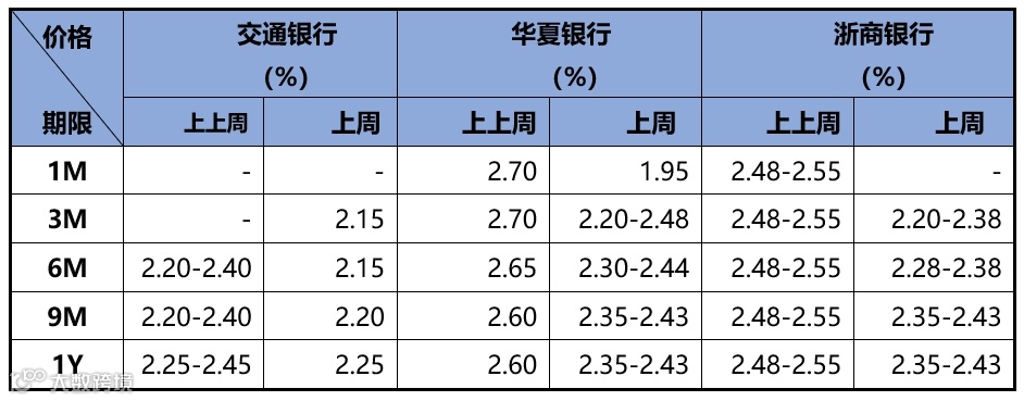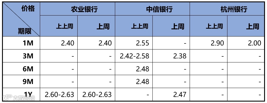 上周为跨年后第一周,资金维持分层状态,银行隔夜利率融出偏多,非银隔夜融出较少价格偏贵。存款价格方面,各期限存款利率较上上周继续大幅回落,下降幅度均值在19bp附近。其中,华夏银行存款利率下降幅度最大,各期限利率均出现大幅下降,其中3M较上上周最高回落50bp。近两周存款市场情况如下表所示: