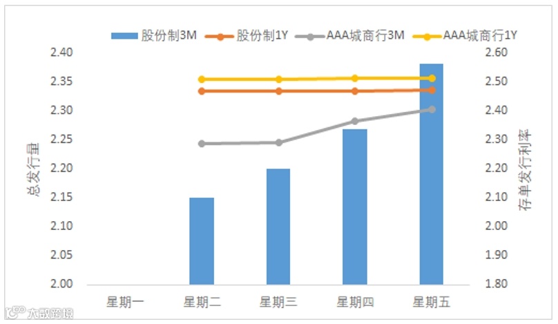 期限利差方面,有201只同业存单发行,实际发行量566.6亿,较上上周减少4713.4亿。上周一级存单市场受工作日到期影响,交投整体清淡;存单二级市场各期限成交收益率出现上行趋势。