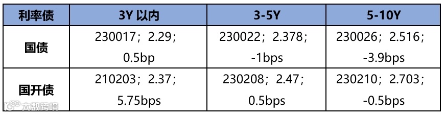 上周各期限利率债收益率较上上周上行,短期限1年期国开债收益率上行约7bp,3年期国开债收益率上行约7bp,5年期国开债收益率上行约3bp,长期限10年期国开债收益率上行约3bp。