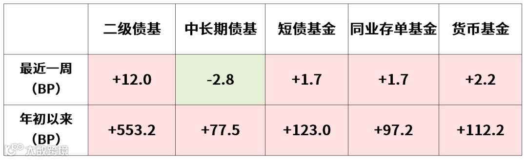 注:数据来源于Wind,口径截至2025.11.09。其中二级债基、中长期债基、短债基金、同业存单基金、货币基金分别对应万得混合债券型二级基金指数(885007.WI)、万得中长期纯债型基金指数(885008.WI)、万得短期纯债型基金指数(885062.WI)、万得同业存单基金指数(885045.WI)、万得货币市场基金指数(885009.WI)。债券利率上行,对应着债券价格下跌,意味着固收类产品的净值趋于震荡或下滑,投资收益下降。反之,债券利率下行,对应着债券价格上涨,意味着固收类产品净值上行,投资收益上升。基金净值上涨1BP=上涨0.01%。“债市震荡上行”仅代表历史表现,不预示未来。